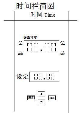 時(shí)間欄里有兩組數(shù)字屏,上面組是計(jì)時(shí)屏,下面組是設(shè)置屏,顯示設(shè)定的時(shí)間值。計(jì)時(shí)屏在溫度沒有達(dá)到計(jì)時(shí)點(diǎn)不計(jì)時(shí),四個(gè)數(shù)字顯示為“00.00”。時(shí)間屏和設(shè)置屏前兩位為整數(shù),后兩位為小數(shù),中間有小數(shù)點(diǎn)。時(shí)間單位可以設(shè)定為“分鐘”也可以設(shè)定為“小時(shí)”。